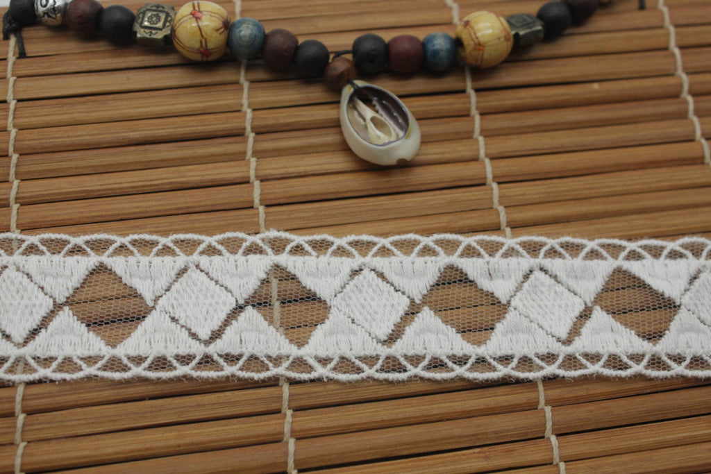 White Cotton Lace Ribbon: Embroidered Diamond Pattern, 1 1/4" Wide