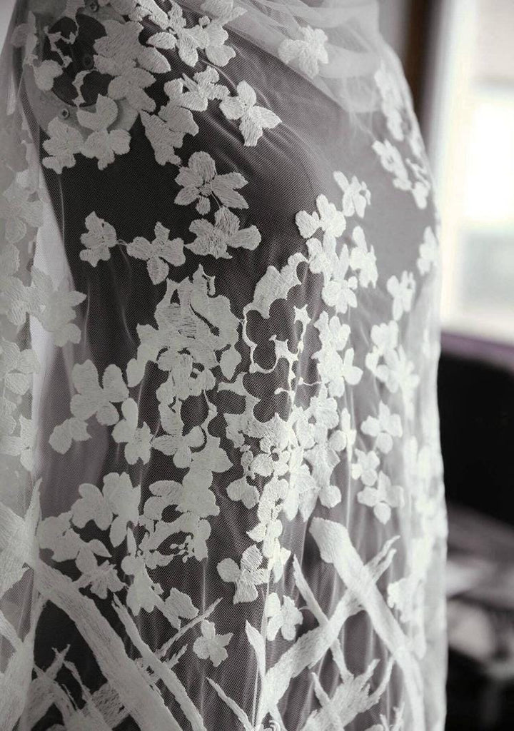 White Embroidered Bridal Lace Fabric - Corded Lace for Wedding Dress