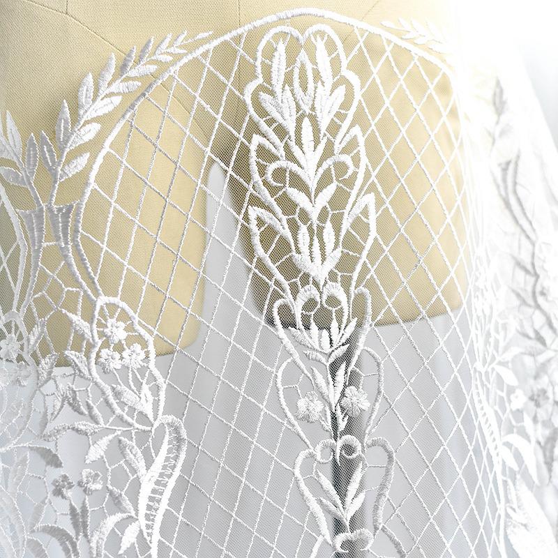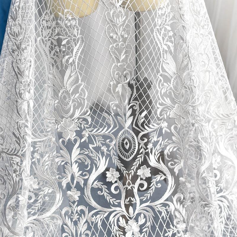 White Embroidered Bridal Lace Fabric - Corded Wedding Gown Lace