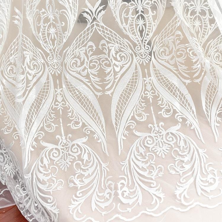 White Embroidered Bridal Lace Fabric - Corded Wedding Gown Lace by Yard