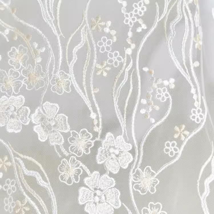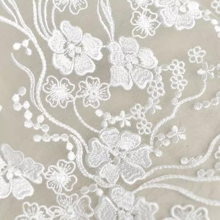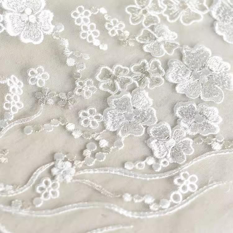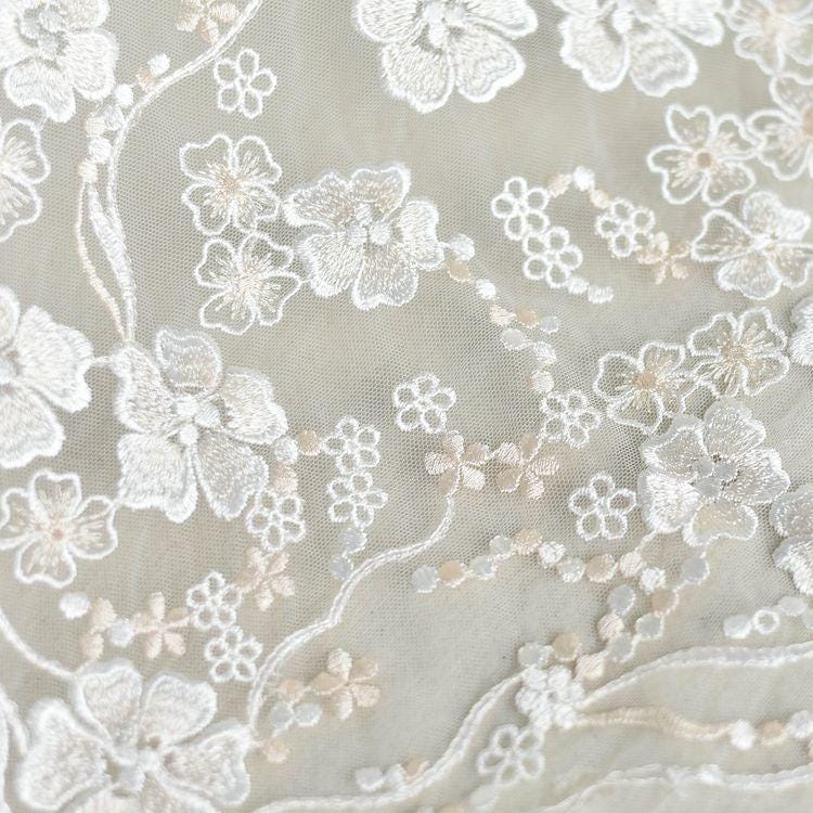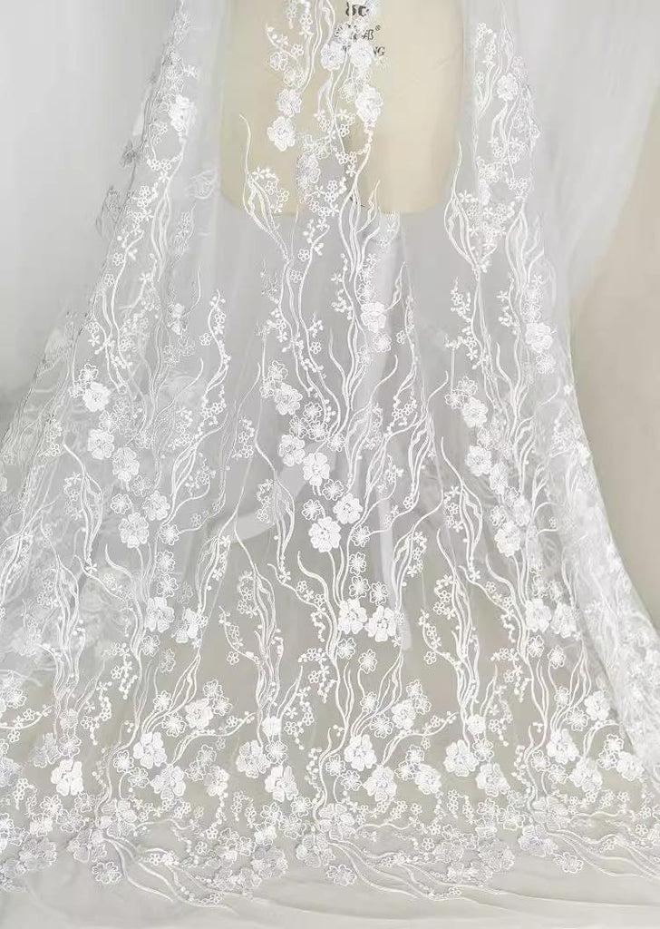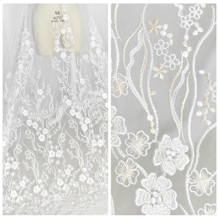 White Embroidered Floral Lace Fabric - Bridal Gown Lace by Yard
